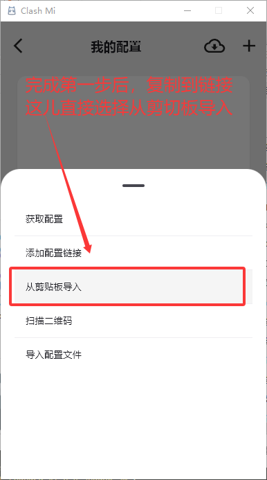 - 完成第一步的复制订阅地址。点击界面上的“+号”,再点击“从剪切板导入”来添加订阅: